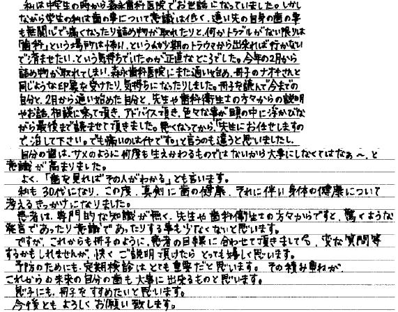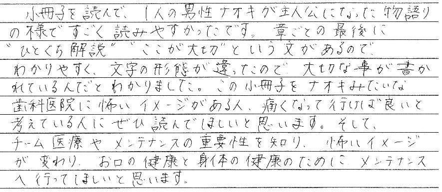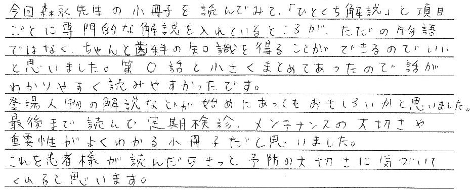 今年の2月から詰め物が取れてしまい、森永歯科医院にまた通い始め、冊子のナオキさんと同じような印象を受けたり、気持ちになったりしました。冊子を読んで今までの自分と、2月から通い始めた自分と、先生や歯科衛生士の方々からの説明やお話、相談に乗って頂き、アドバイス頂き、色々な事が頭の中に浮かびながら最後まで読ませて頂きました。悪くなってから、「先生にお任せしますので、治して下さい。でも痛いのはイヤです。」と言うのも違うと思いましたし、自分の歯は、サメのように何度も生えかわるものではないから大事にしなくてはなぁ~、と意識が高まりました。